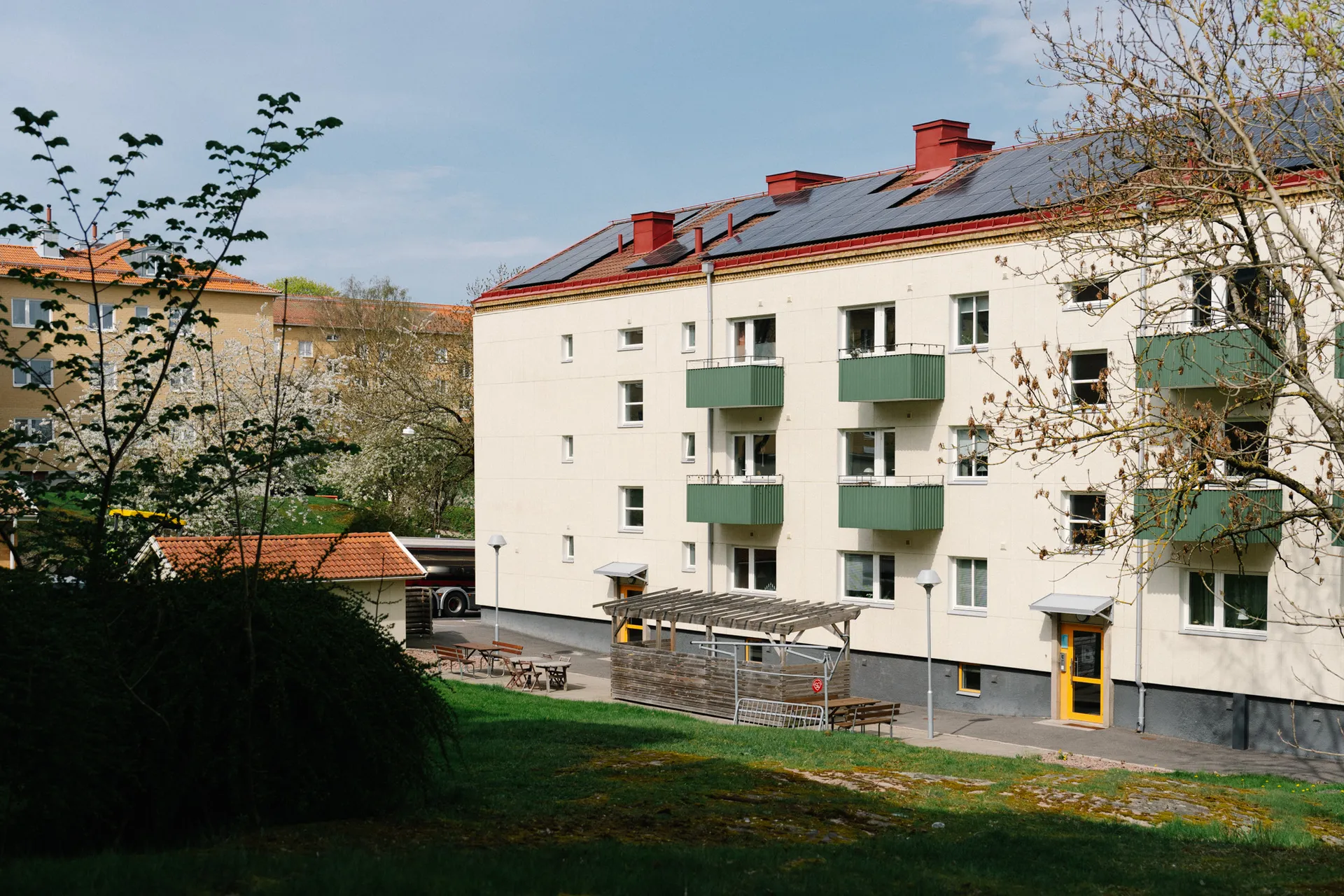 Närmsta busshållplats ligger 300 meter från huset och bussen tar dig till Brunnsparken på tio minuter. Buss nr 60 stannar vid hållplats Framnäsgatan. Du kan också ta spårvagn 2 och 4 till Annedal.